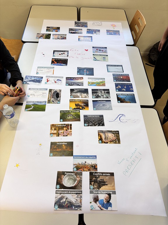 L’après-midi a été consacrée à la réalisation d’une Fresque du Climat, un atelier participatif autour des enjeux du changement climatique. Les étudiants ont travaillé en groupes pour identifier les causes et conséquences du dérèglement climatique, reliant les différents facteurs à l’origine de ce phénomène.